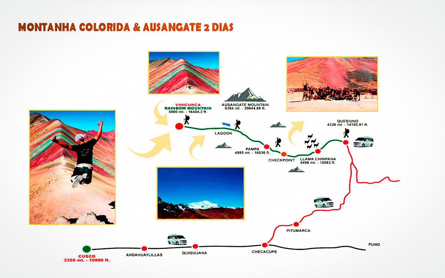 É um lugar mágico com belas paisagens dos Andes o Peru. Principalmente nós iremos para as montanhas das cores ou chamada também de cerro colorido, antes de passar a noite na comunidade de pastagem de alta altitude. No dia seguinte, teremos uma experiência agradável na região do Cusco, a Montanha de Ausangate é considerada pelas pessoas da região como um deus ligada a Pacha Mama (mãe terra).
